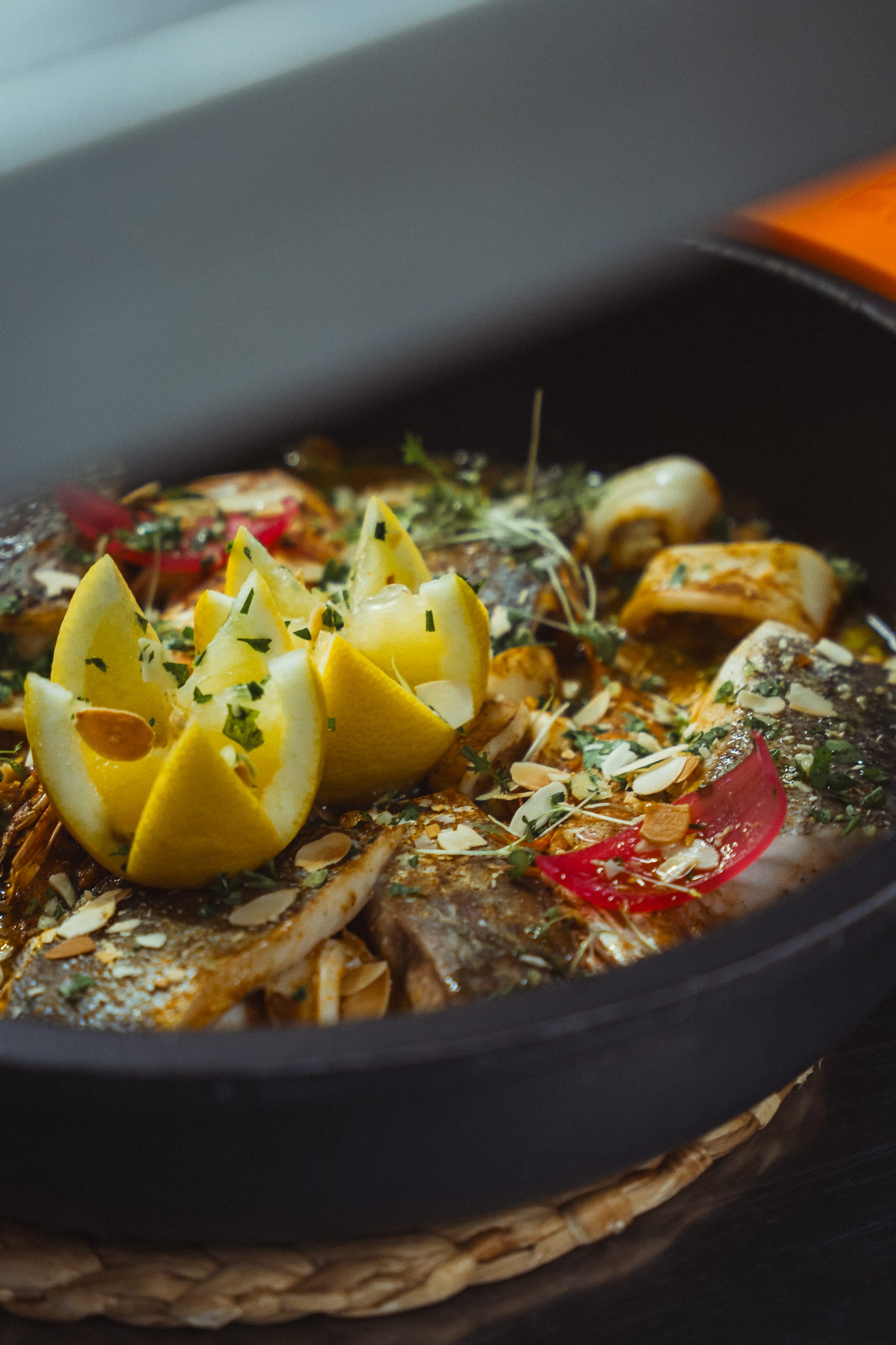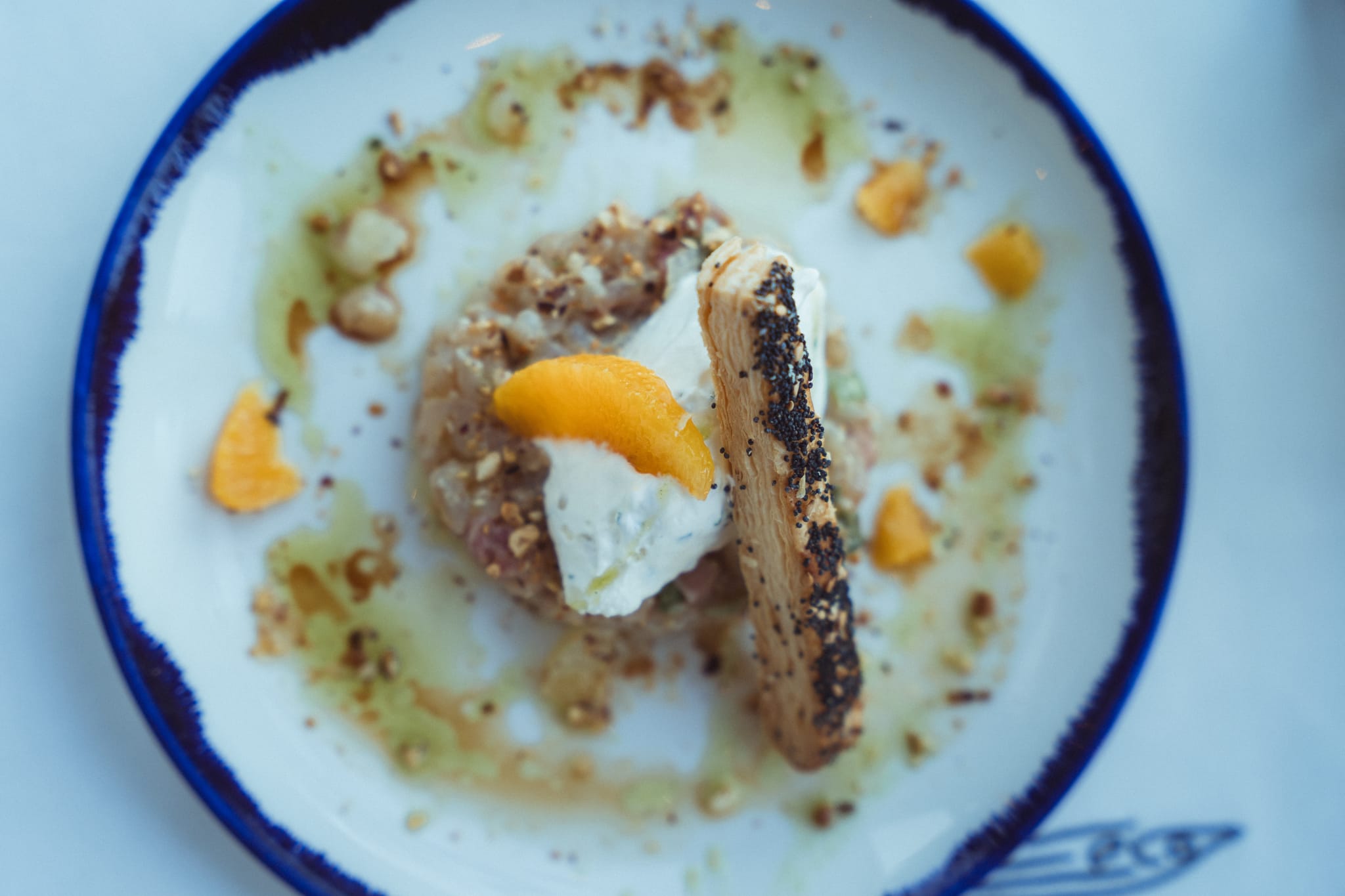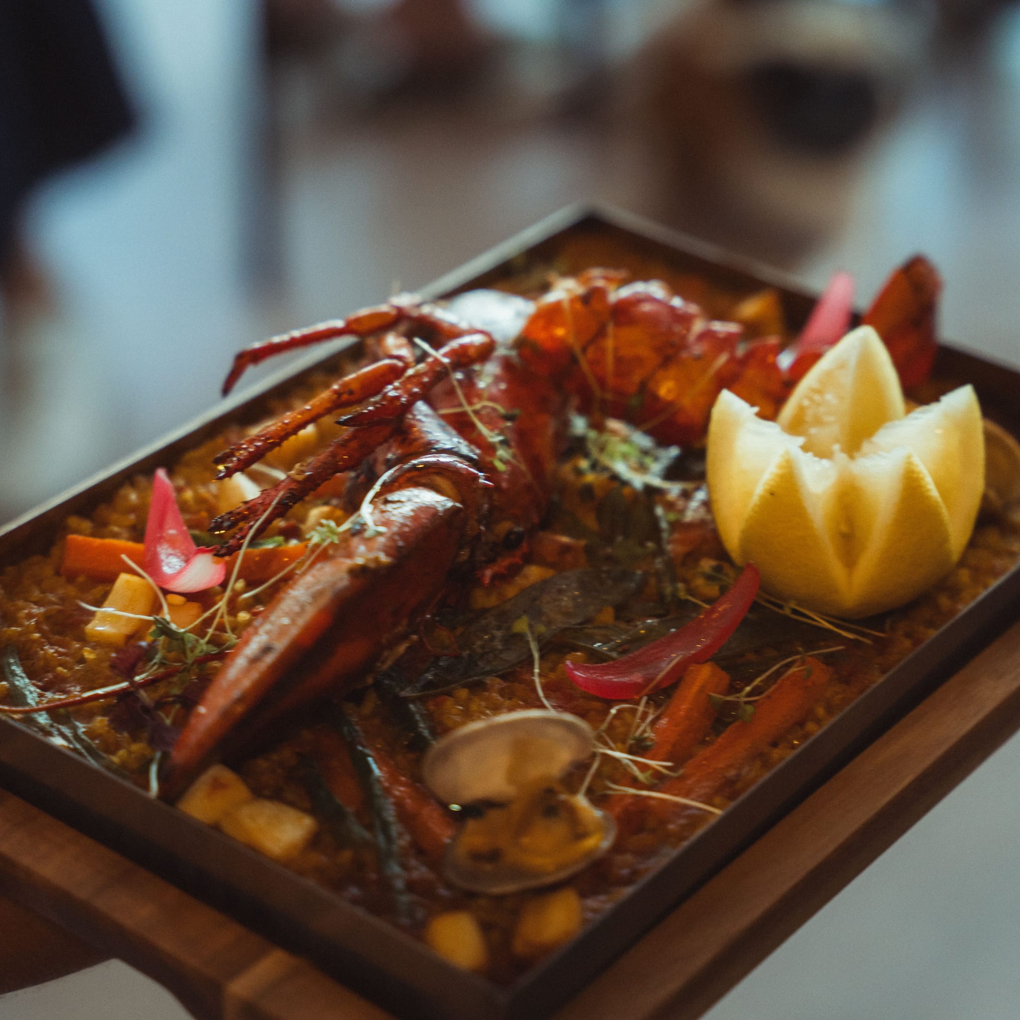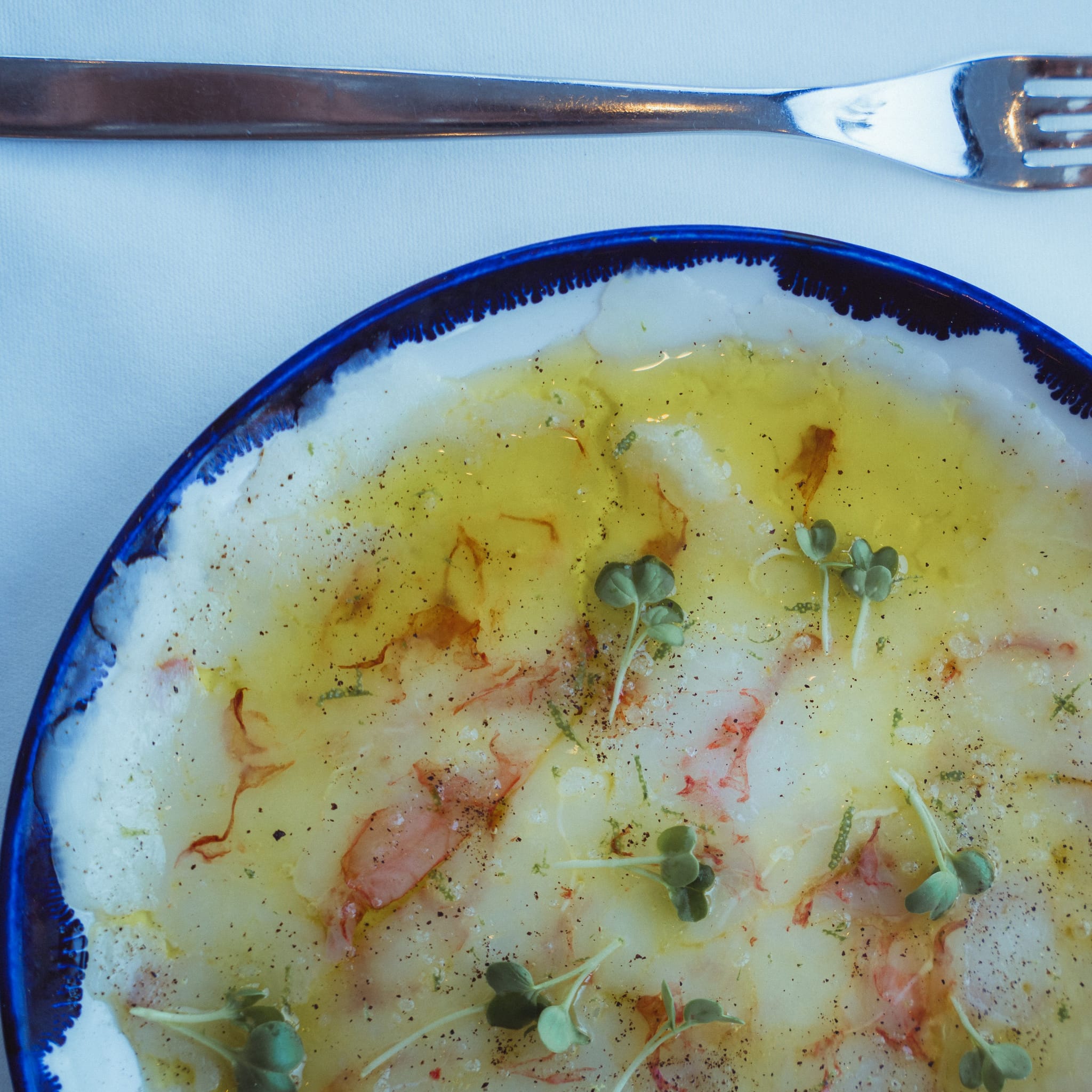 Perché sur votre tabouret en cordes tressées, vous attendez votre table. Dérobé derrière le bar à cocktails, le restaurant dévoile son décor nautique sur mesure. Bleu Klein, lin, cordages, filets de pêche suspendus, perspectives arrondies et mur végétal sont une déclaration d’amour à la Méditerranée qui s’étire au-delà de l’immense terrasse et inspire les créations du Chef, Kévin Védrines. Le regard plongé dans la mer turquoise, vous goûtez les saveurs maîtrisées et parfaitement équilibrées d’une cuisine d’ici, de saison, raisonnée, colorée et conviviale, élaborée comme une ode aux produits de la mer, au terroir et à la gastronomie catalane.